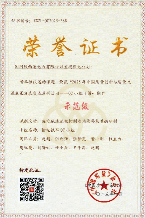 宝鸡公司“输电铁军”QC小组聚焦专业难点,充分发挥团队示范优势,《架空地线远程控制电动修补装置》QC成果荣获2025年国家电网有限公司优秀QC成果一等奖、“2025年中国质量创新与质量改进成果发表交流系列活动”示范级成果。