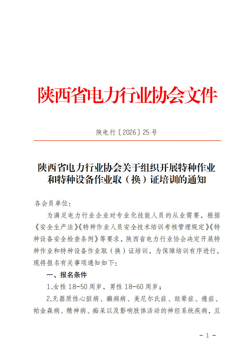 陕西省电力行业协会关于组织开展特种作业和特种设备作业取(换)证培训的通知